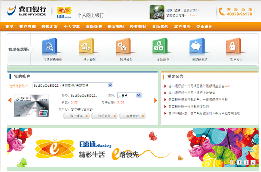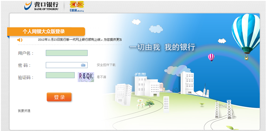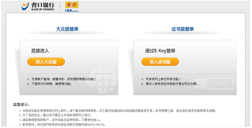 登錄營(yíng)口銀行官方網(wǎng)站(www.sccdh.com),選擇個(gè)人網(wǎng)上銀行,點(diǎn)擊“進(jìn)入大眾版”![]() 點(diǎn)擊“進(jìn)入大眾版”后出現(xiàn)登錄頁(yè)面:![]() ![]() |
